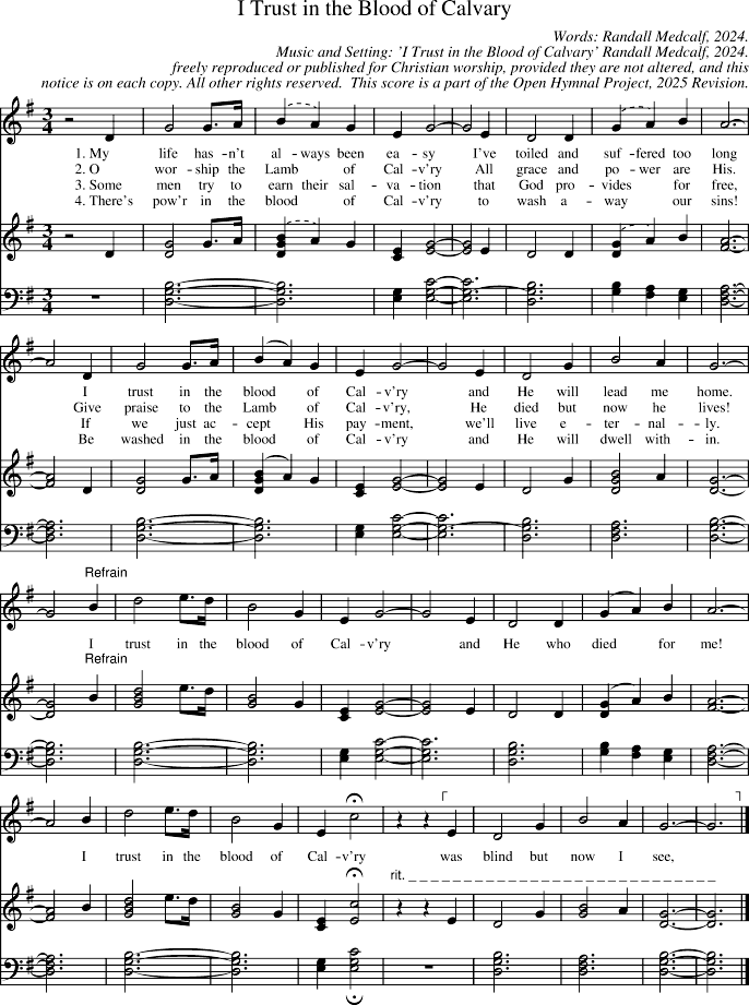 copyright: Words and Music Copyright © 2025, Randall Medcalf. These lyrics and music may be freely reproduced or published for Christian worship, provided they are not altered, and this notice is on each copy. All other rights reserved. This score is a part of the Open Hymnal Project, 2025 Revision.