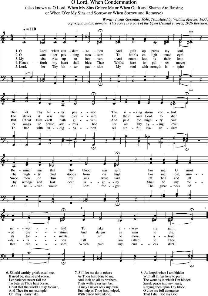 1. O Lord, when condemnation And guilt oppress my soul, Then let Thy bitter passion The rising storm control: Remind me that Thy blood was spilt For me, O most unworthy! To take away my guilt.