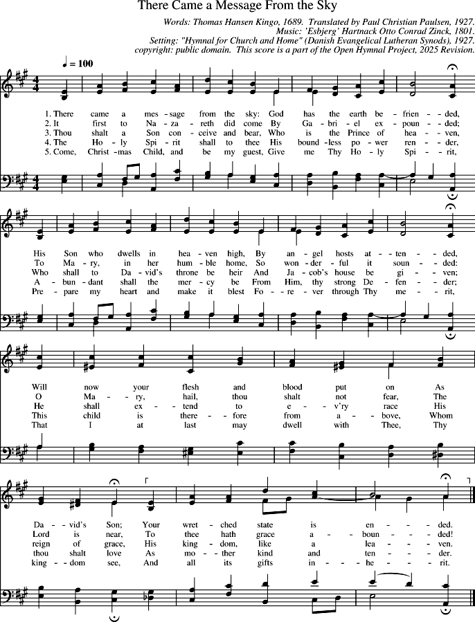 1. There came a message from the sky: God has the earth befriended, His Son who dwells in heaven high, By angel hosts attended, Will now your flesh and blood put on As David's Son; Your wretched state is ended.